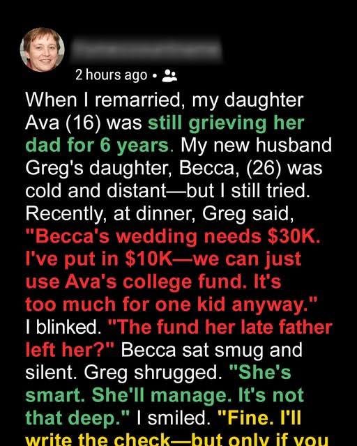 When Greg casually suggested using Ava’s college fund to pay for his adult daughter Becca’s wedding, I was stunned. That fund was created by Ava’s late father, David — his last gift to ensure she’d have the future he never did. Greg’s tone carried entitlement, and Becca’s silence spoke volumes, as if this decision had already been made without me. I stayed calm, knowing I needed a clear plan to protect what truly mattered.