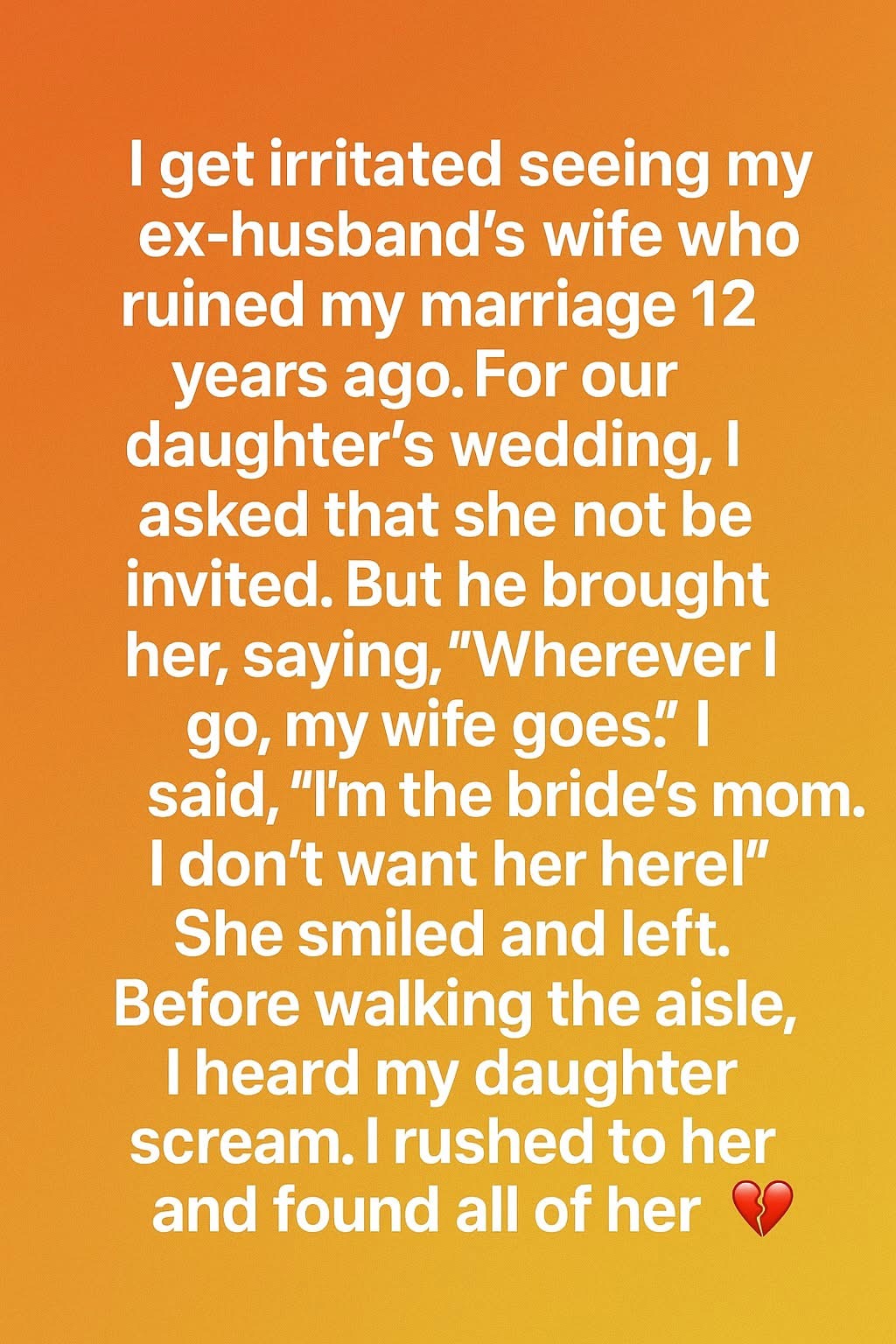 I get irritated seeing my ex-husband’s wife, the woman who entered his life while I was still his spouse. It has been twelve years since our marriage ended, yet the memories still sting. When our daughter’s wedding approached, I made a heartfelt request: that she not be invited. This was my daughter’s day, and I wanted the focus to be on her, not on old wounds. But my ex-husband arrived with his wife anyway, insisting, “Wherever I go, my wife goes.” I reminded him firmly, “I’m the bride’s mother. I don’t want her here.” To my surprise, she simply smiled, nodded, and quietly left without protest.