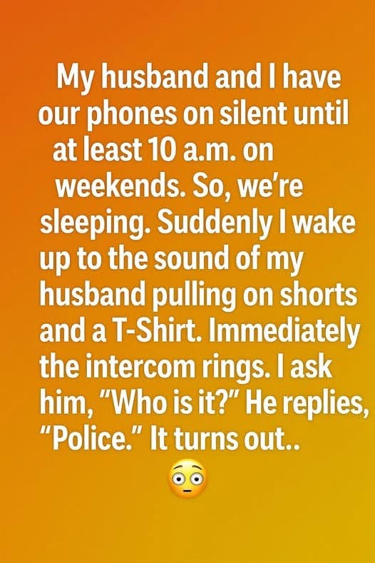 My husband and I have a weekend routine where we keep our phones on silent until at least 10 a.m. so we can sleep in without interruptions. One Saturday morning, I was deep asleep when I suddenly heard him getting out of bed and hurriedly putting on shorts and a T-shirt. Before I could fully wake up, the intercom rang loudly, echoing through the house. Confused and a bit nervous, I asked him, “Who is it?” He paused for a moment before replying, “The police.”