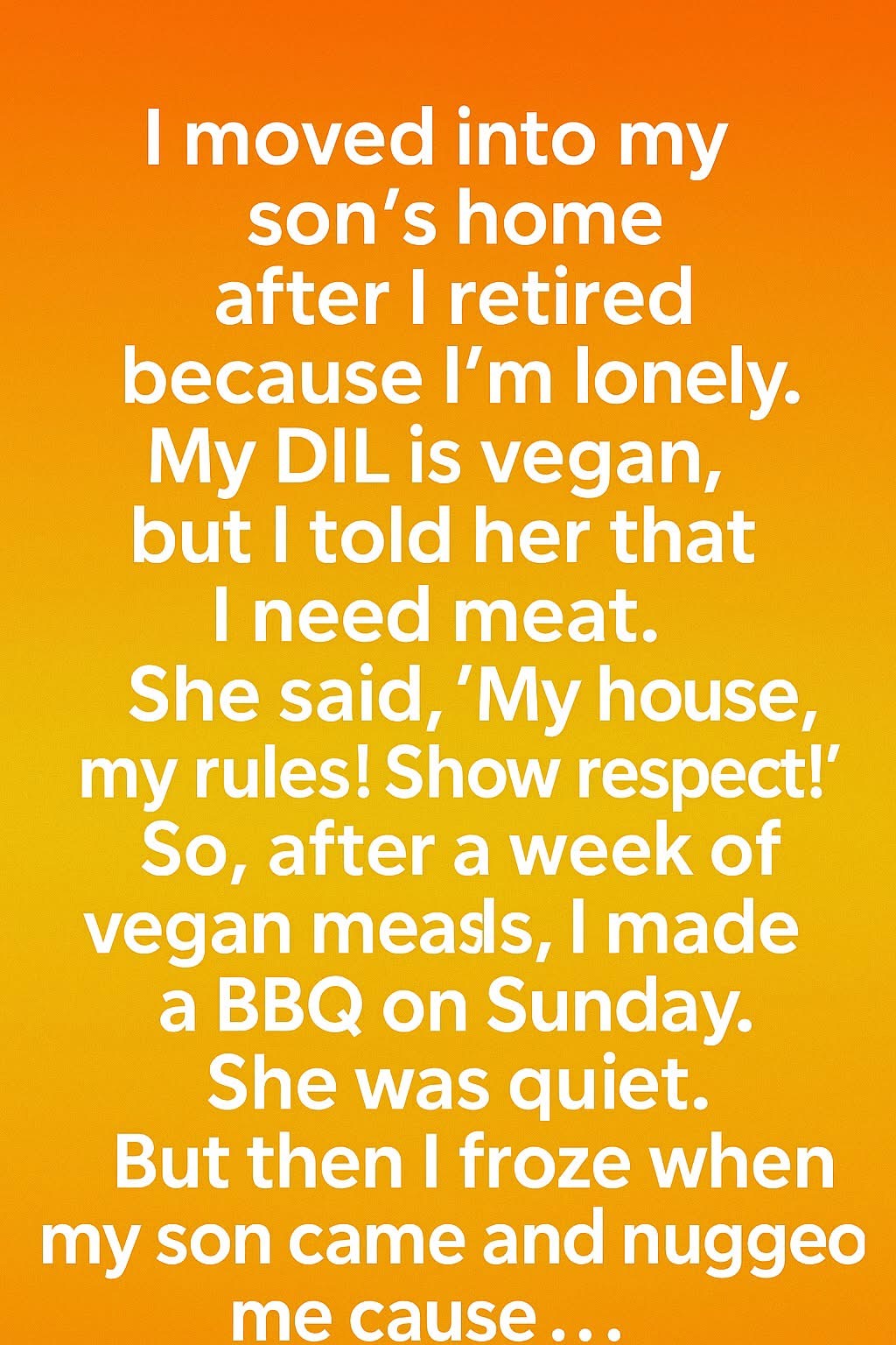 When I moved into my son’s home after retiring, I thought it would be a chance to feel less lonely. My daughter-in-law welcomed me kindly, but she was clear about her lifestyle—she was vegan and preferred the home to follow that path. At first, I felt uncomfortable, worried that my needs would be overlooked. I tried to explain that I was used to eating meat, hoping for some compromise. Her response was firm but honest: “My house, my rules. Please show respect.”