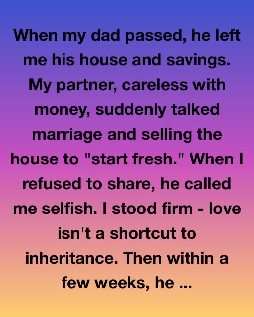 When my dad passed, he left me his house and savings. My partner, careless with money, suddenly talked marriage and selling the house to “start fresh.” When I refused to share, he called me selfish. I stood firm—love isn’t a shortcut to inheritance. Then within a few weeks, he packed up his stuff and left.
