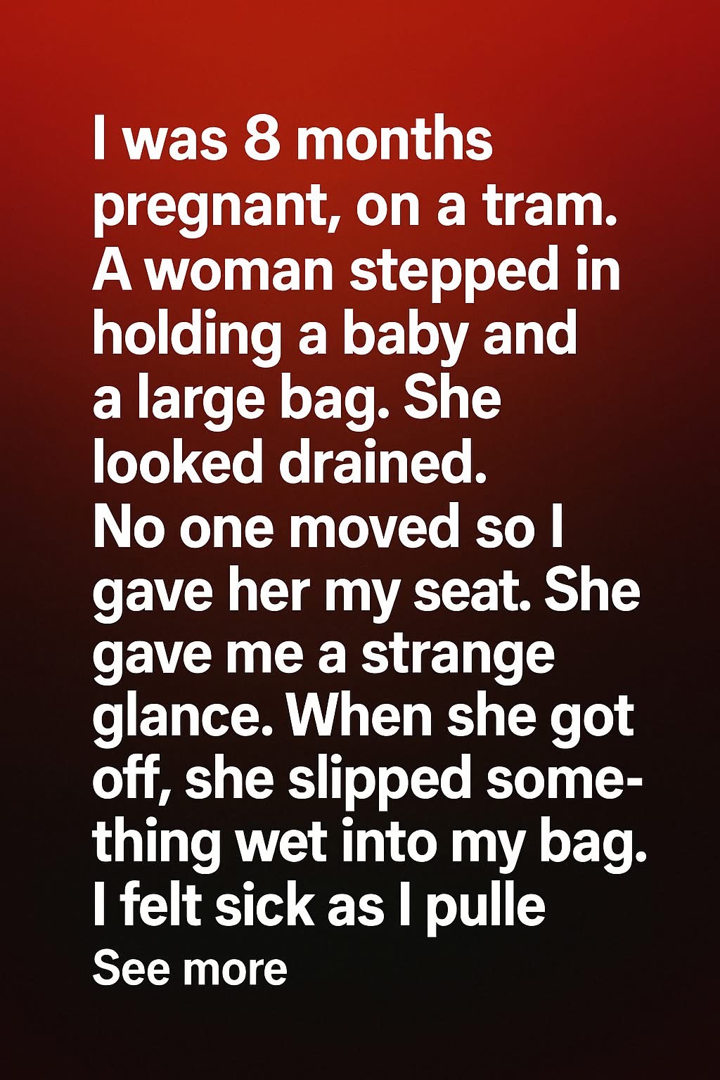 As the tram rattled along, I noticed her clutching the baby tightly, whispering softly to calm it. When her stop came, she gave me another unreadable glance before leaving. Moments later, I felt something wet and cold in my bag. My heart raced as I reached inside, terrified of what it might be. To my surprise, I pulled out a small, damp bundle wrapped in a cloth.