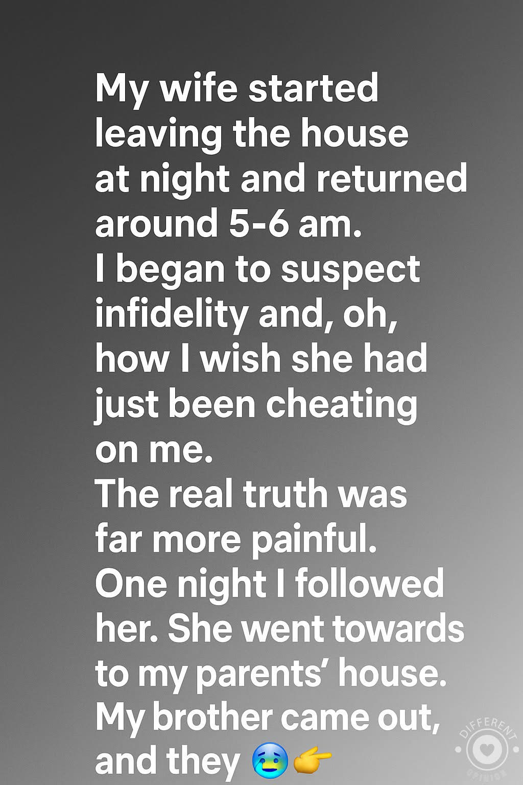 My wife hadn’t been sneaking out for herself; she’d been sacrificing her sleep, caring for my dad so I wouldn’t worry, while my brother worked late shifts.I stumbled back, overwhelmed with guilt for ever doubting her. The next morning, I hugged her tightly and told her I knew. She smiled softly and said, “I just didn’t want you to carry this burden alone.”That night, I realized love isn’t always loud or obvious. Sometimes, it’s found in the quiet sacrifices people make in the dark, when no one is watching.