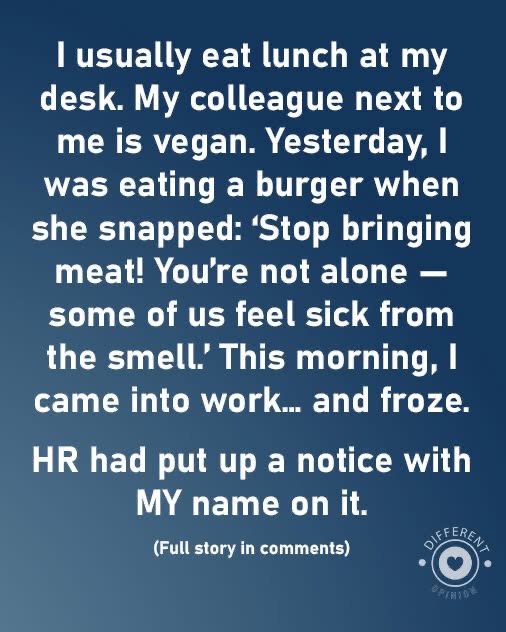 An employee walked into work this morning and was blindsided by an HR notice with his name plastered on it — all because his vegan colleague claimed the smell of his lunch “made her sick.”
