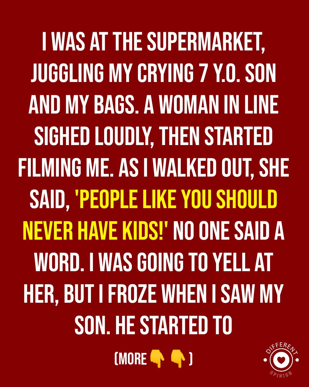 I was at the supermarket, juggling my crying 7-year-old son and my bags.