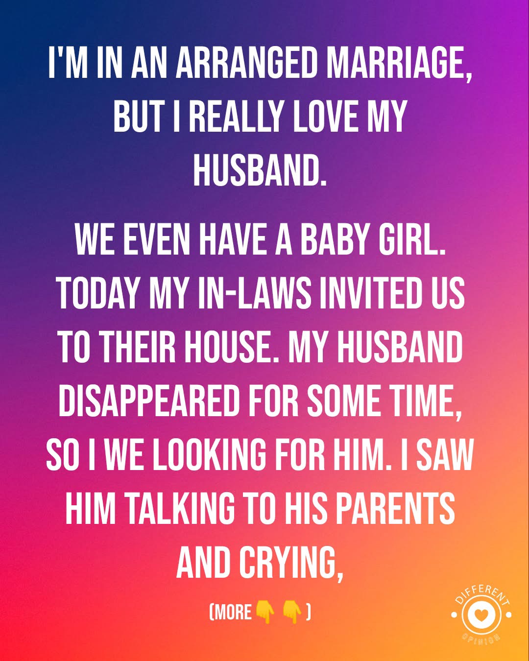 I’m in an arranged marriage, but I really love my husband. We even have a baby girl. Today my in-laws invited us to their house. My husband disappeared for some time, so I went looking for him. I saw him talking to his parents and crying, and I froze at the doorway, unsure whether to step in or walk away silently.