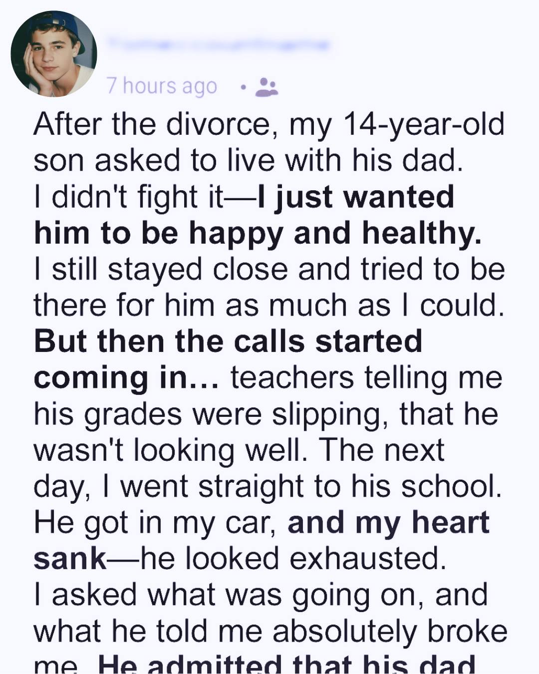 Not because I wanted to — I would have kept him close forever if I could — but because I didn’t want to stand in the way of a father and son trying to rebuild something. I told myself I was doing the right thing. Giving space, not giving up. But in truth, the decision quietly broke me.