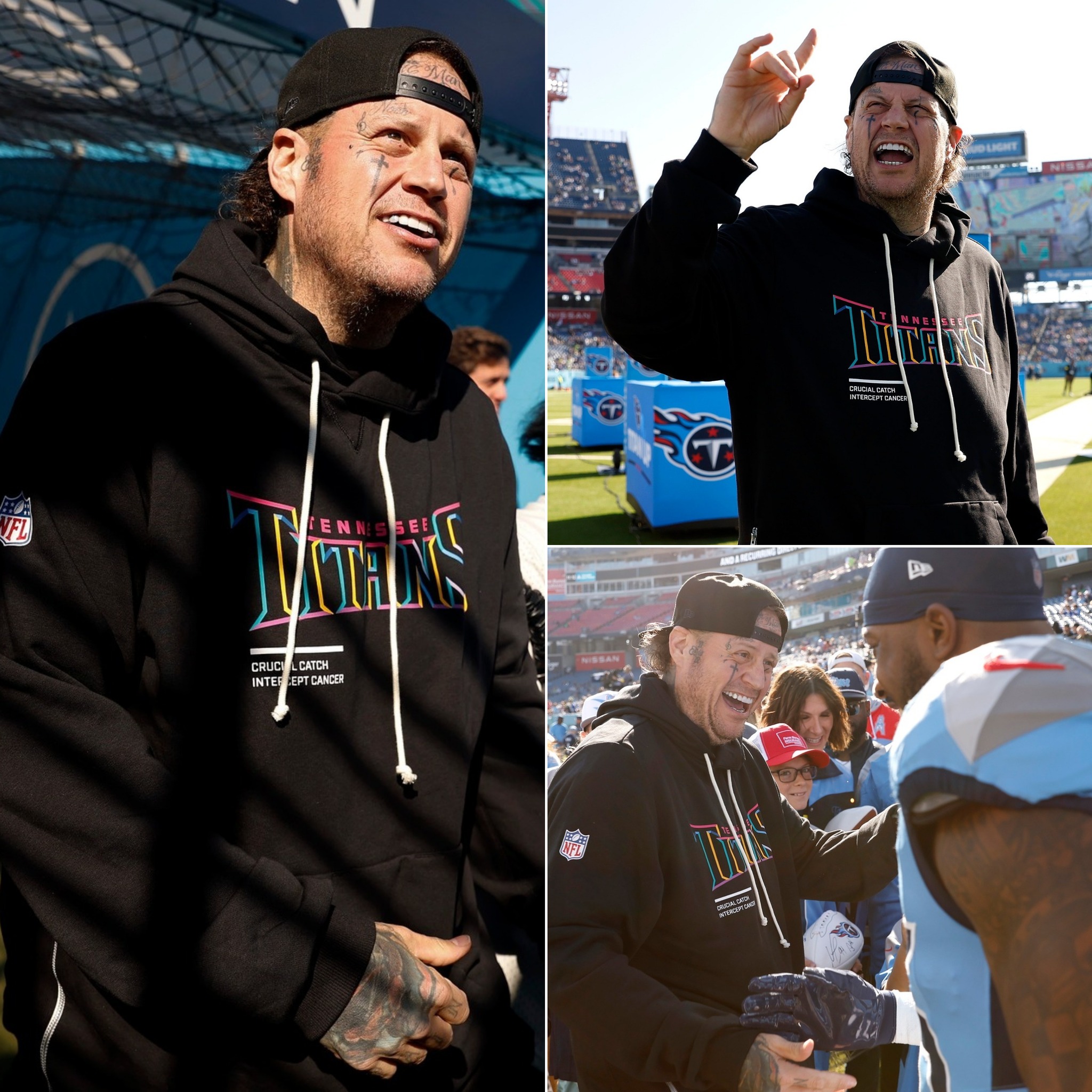 At Nissan Stadium, Jelly Roll mingled with fans, enjoyed the atmosphere, and posted game-day moments on social media. His clean-shaven face highlighted a brighter, more polished look while still keeping the down-to-earth charm that has made him one of the most relatable figures in modern music.