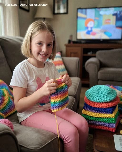 It started with little things, scrunchies, coasters, and small plush animals. But one evening, after watching a video about children going through chemotherapy and how they often received handmade hats from volunteers, she said softly, “I want to make some too.”