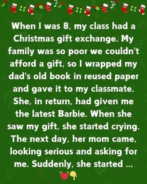My family was so poor we couldn’t afford a gift, so I wrapped one of my dad’s old books in reused gift paper and gave it to my classmate. She, in return, had given me the latest Barbie. When she saw my gift, she started crying.