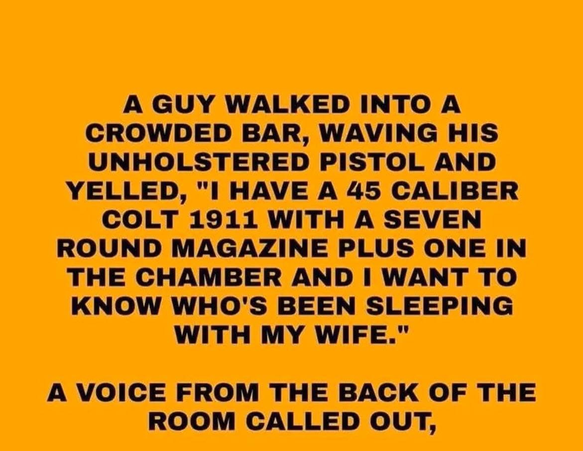 “I have a 45 caliber Colt 1911 with a seven round magazine plus one in the chamber and I want to know who’s been sleeping with my wife.”