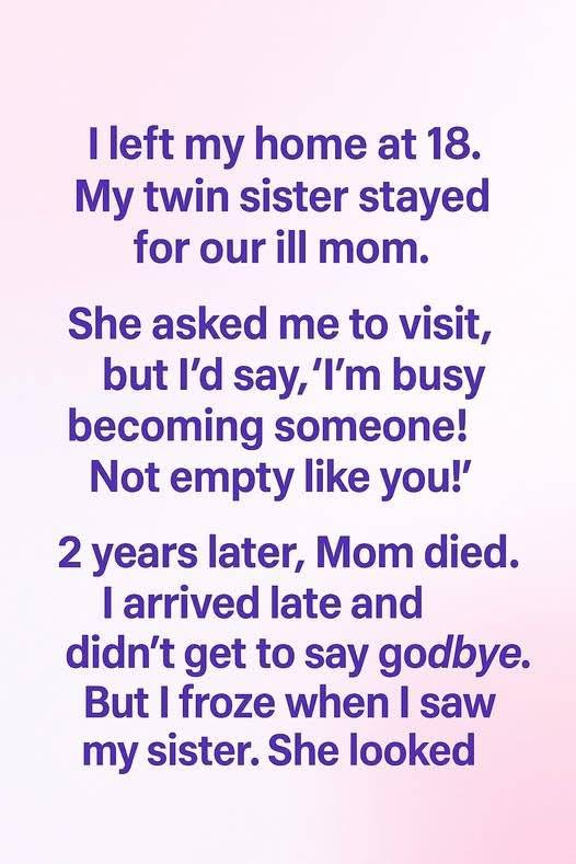I left my home at 18. My twin sister stayed for our ill mom. She asked me to visit, but I’d say, “I’m busy becoming someone! Not empty like you!” For years, I believed success only lived outside our small town, far from the quiet life my sister chose. She spent her days caring for Mom, while I chased opportunities, convinced that love and responsibility could wait.