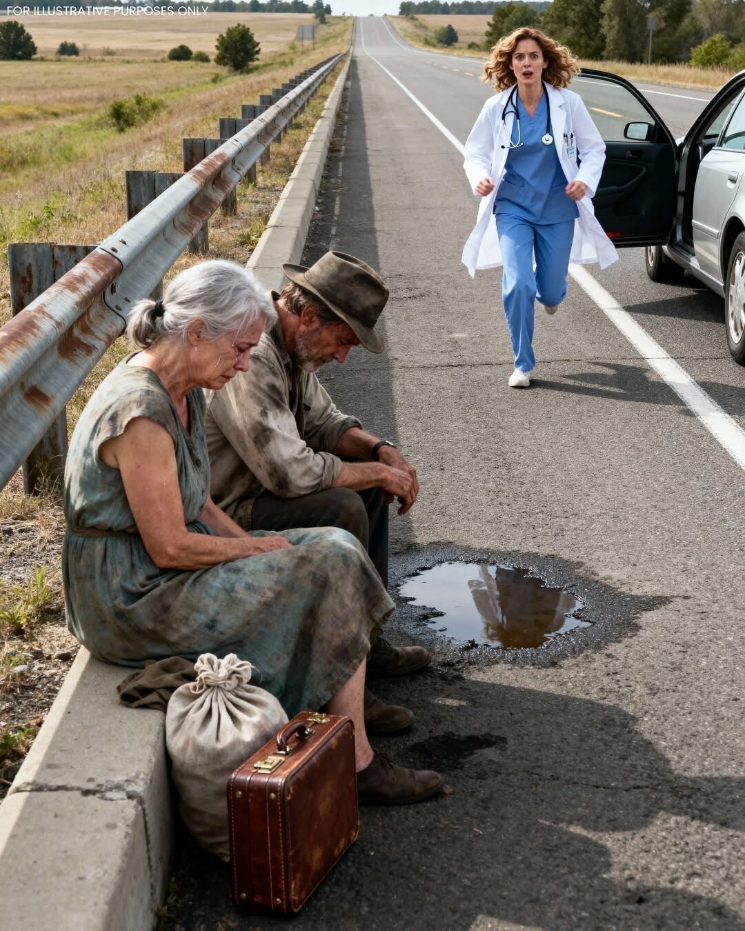 On a humid July afternoon, she was driving back from a medical conference. Her mind drifted between exhaustion and the soft thrum of the radio. The landscape rolled out in wide stretches of farmland and faded barns. Then she saw them. Two elderly figures at the side of the road, sitting on suitcases, thin and slumped as if life itself had deflated them. Corinne slowed. Her heart tugged with something she could not immediately identify. Pity perhaps. Or maybe recognition. She pulled over.