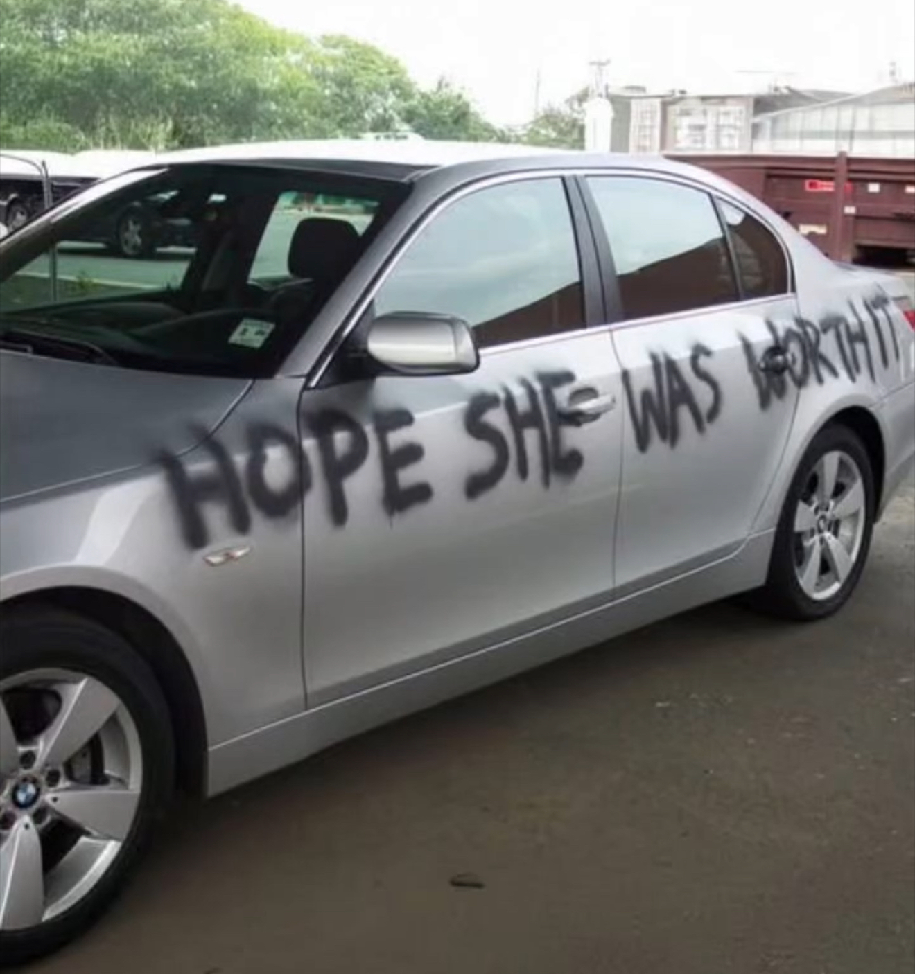 Scrawled across the driver’s side door in bold, unapologetic letters were the words: “Hope She Was Worth It.”