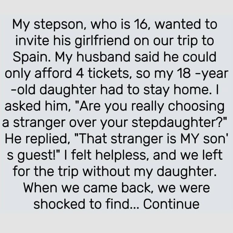 My 16 y.o. stepson wants to invite his new girlfriend on our trip to Spain. My husband agreed but said he can’t afford more than 4 tickets, so we have to leave my 18 y.o. daughter at home. I was furious and blamed him for choosing a stranger over his own stepdaughter whom he’d been raising since she was 7. He replied,replied,
