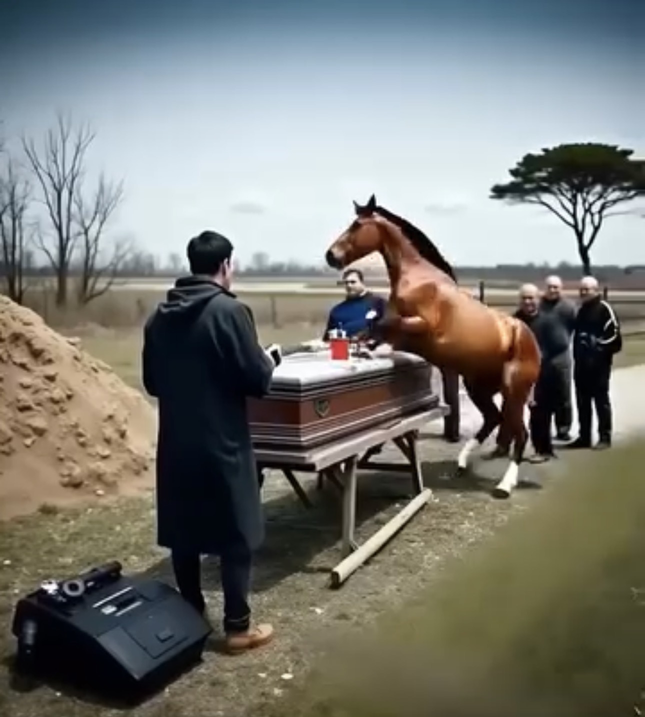 Before anyone could intervene, Astoria reared up and struck the lid of the coffin. The sound of splintering wood echoed through the cemetery like a gunshot. The guests gasped, some assuming the animal had succumbed to a violent episode of grief-induced psychosis. She struck again, her hooves cracking the heavy oak lid. It appeared to be an act of desecration, but Astoria’s behavior remained strangely deliberate. She wasn’t kicking wildly; she was targeting the area near the head of the casket.