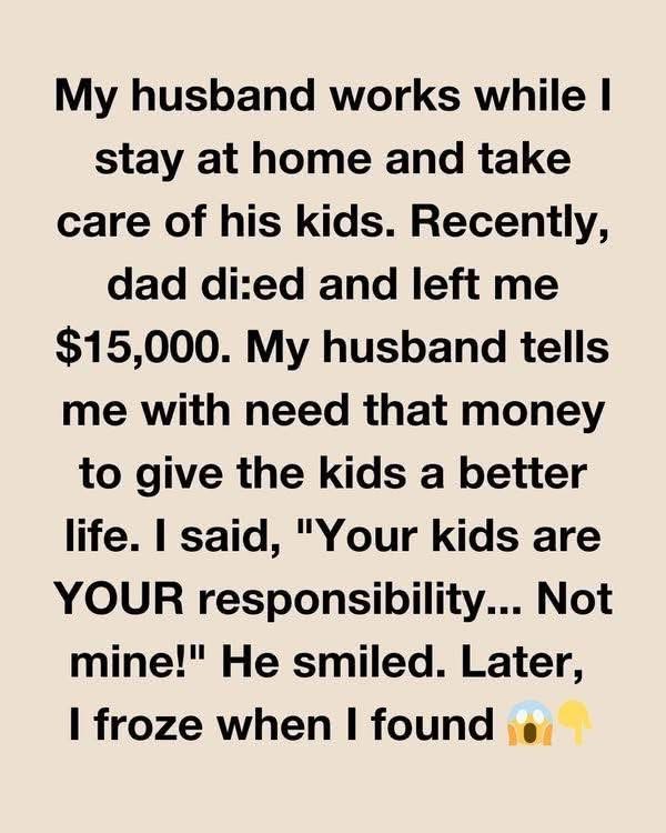 Recently, my dad di:ed and left me a $15,000 inheritance, and my husband tells me we need the money to give the kids a better life. I told him, “Your kids are your responsibility… Not mine! It’s NOT my responsibility to provide for them!”He just smiled. Later that day, I froze when I found my closet empty. Most of my bags and shoes were gone. I went to the living room, where my husband was, and saw my things packed in boxes.He said, “I thought marriage was about supporting each other, but clearly, you don’t believe in that!” Then, with a smirk, he added, “Now that you have your dad’s money, maybe you can spend it on buying your own stuff.” I couldn’t believe my eyes!