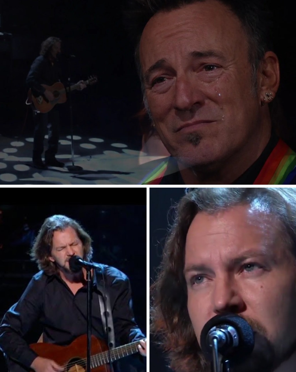 As Vedder sang, the camera cut to Springsteen seated in the audience. He listened silently, visibly moved, his expression revealing something deeper than admiration. It was recognition. Vedder wasn’t simply performing a song—he was inhabiting it, filtering it through his own life and convictions while honoring the man who shaped so many artists who followed.