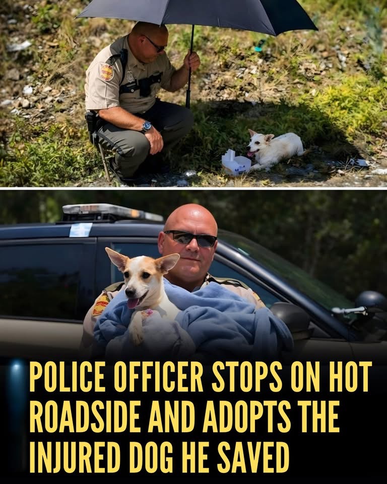 On an extremely hot summer afternoon, a highway patrol officer noticed something many drivers had unknowingly passed — a small, injured dog lying helplessly on the side of the road. The pavement was burning, the sun was relentless, and the dog was clearly terrified, dehydrated, and unable to move.