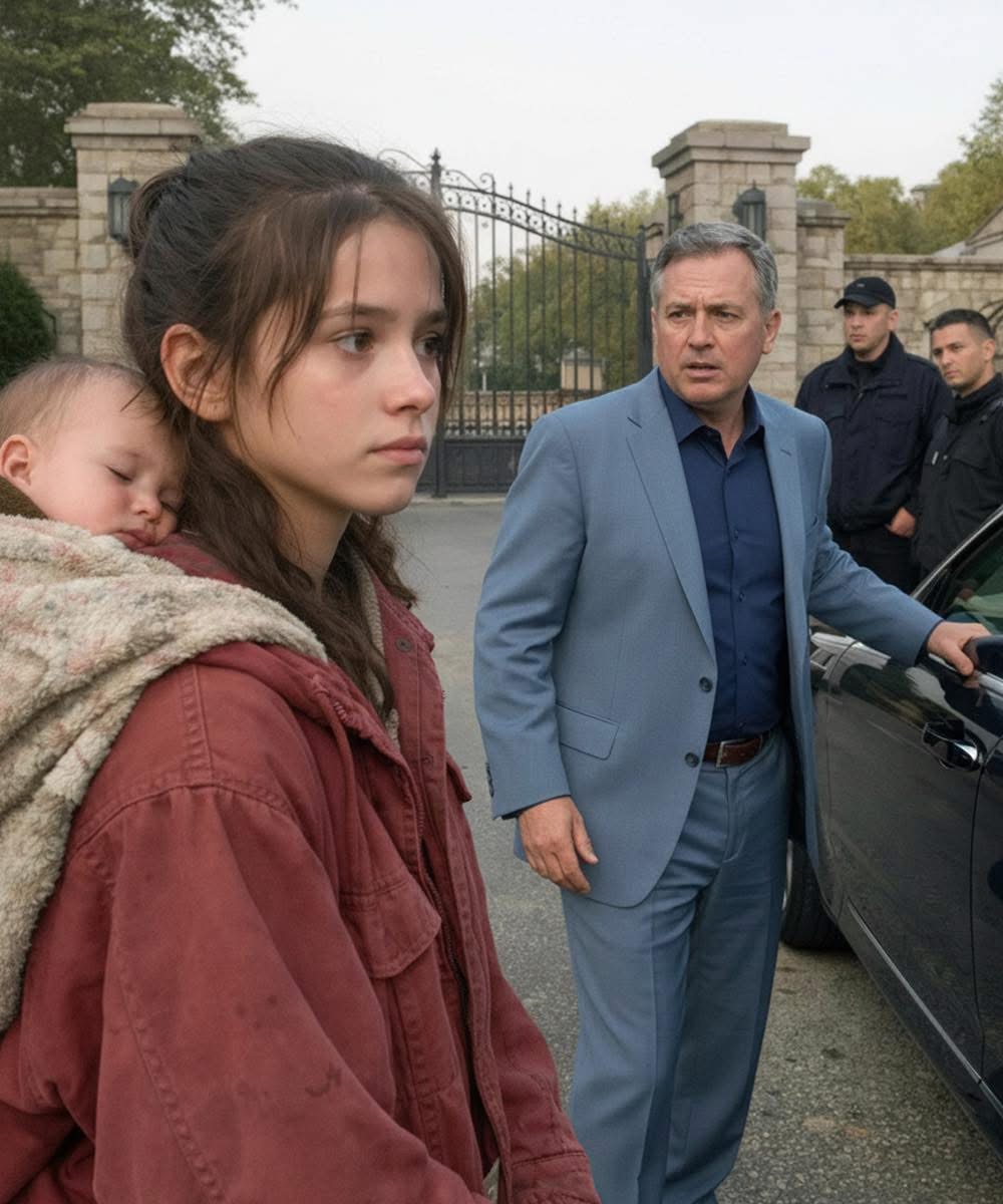 The girl startled. She instinctively shifted, tightening the cloth that secured the baby, as though preparing to be turned away or escorted off the property. Her gaze flicked toward the guards, then cautiously returned to Victor.