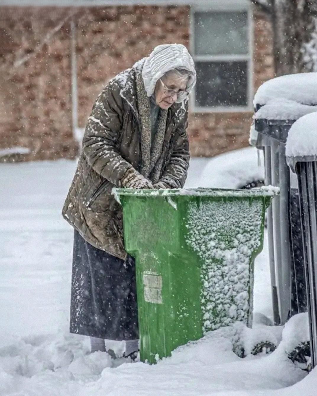 An elderly woman crouched by the dumpster, wearing a thin gray coat far too big for her. Her hands shook as she pulled a half-crushed sandwich from the trash.