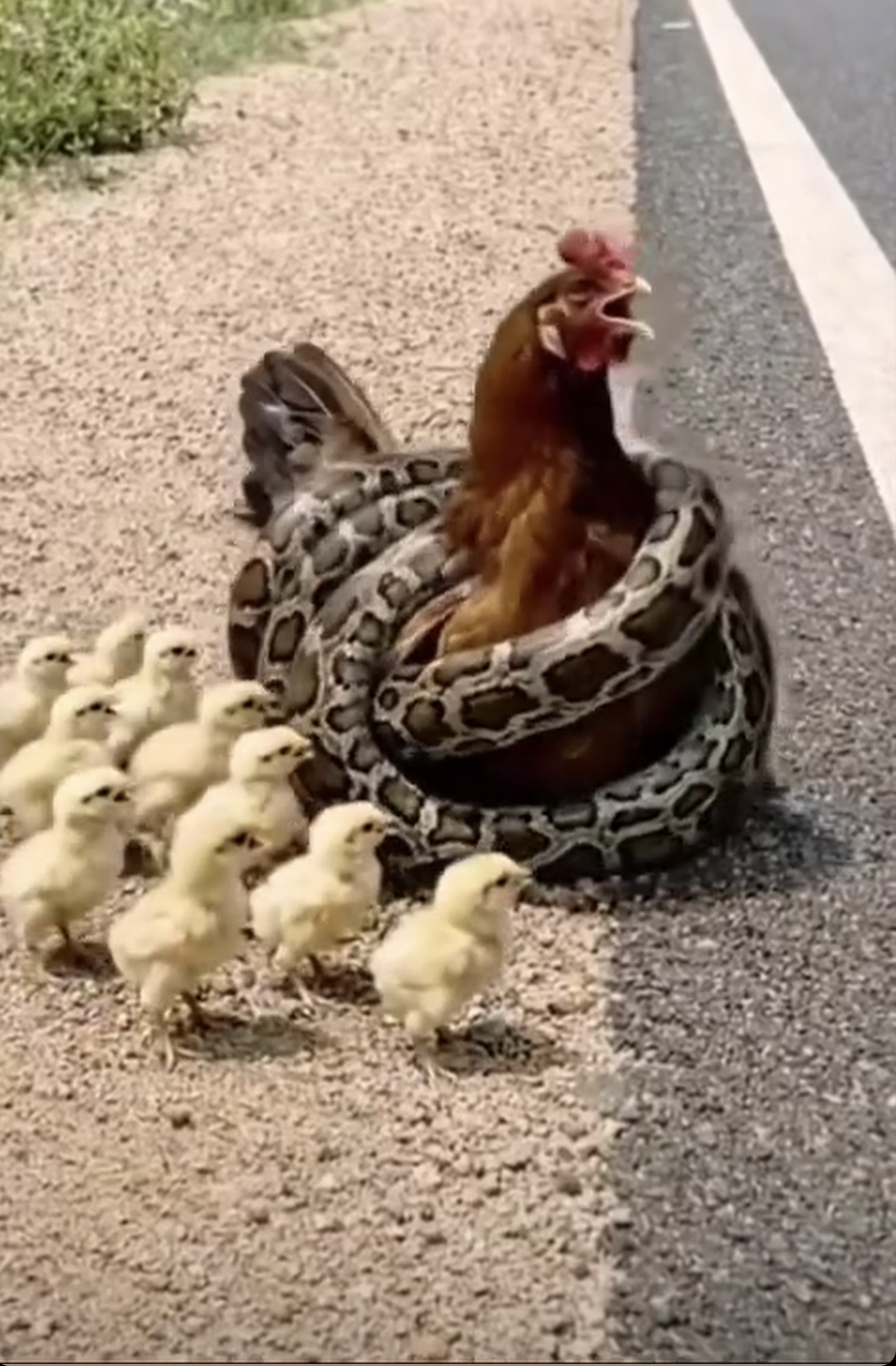 On a quiet roadside, a mother hen stands her ground—surrounded by her tiny chicks and wrapped in an unexpected moment of danger. Whether chance or coincidence, the scene captures pure instinct: protect the little ones, no matter what. Nature has a way of surprising us when we least expect it.