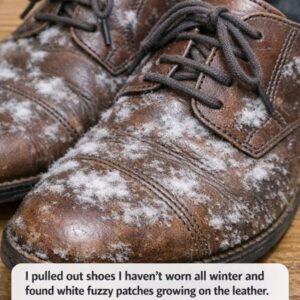 I just pulled out some shoes I didn’t wear over winter and saw white fuzzy patches on the leather. What’s going on?