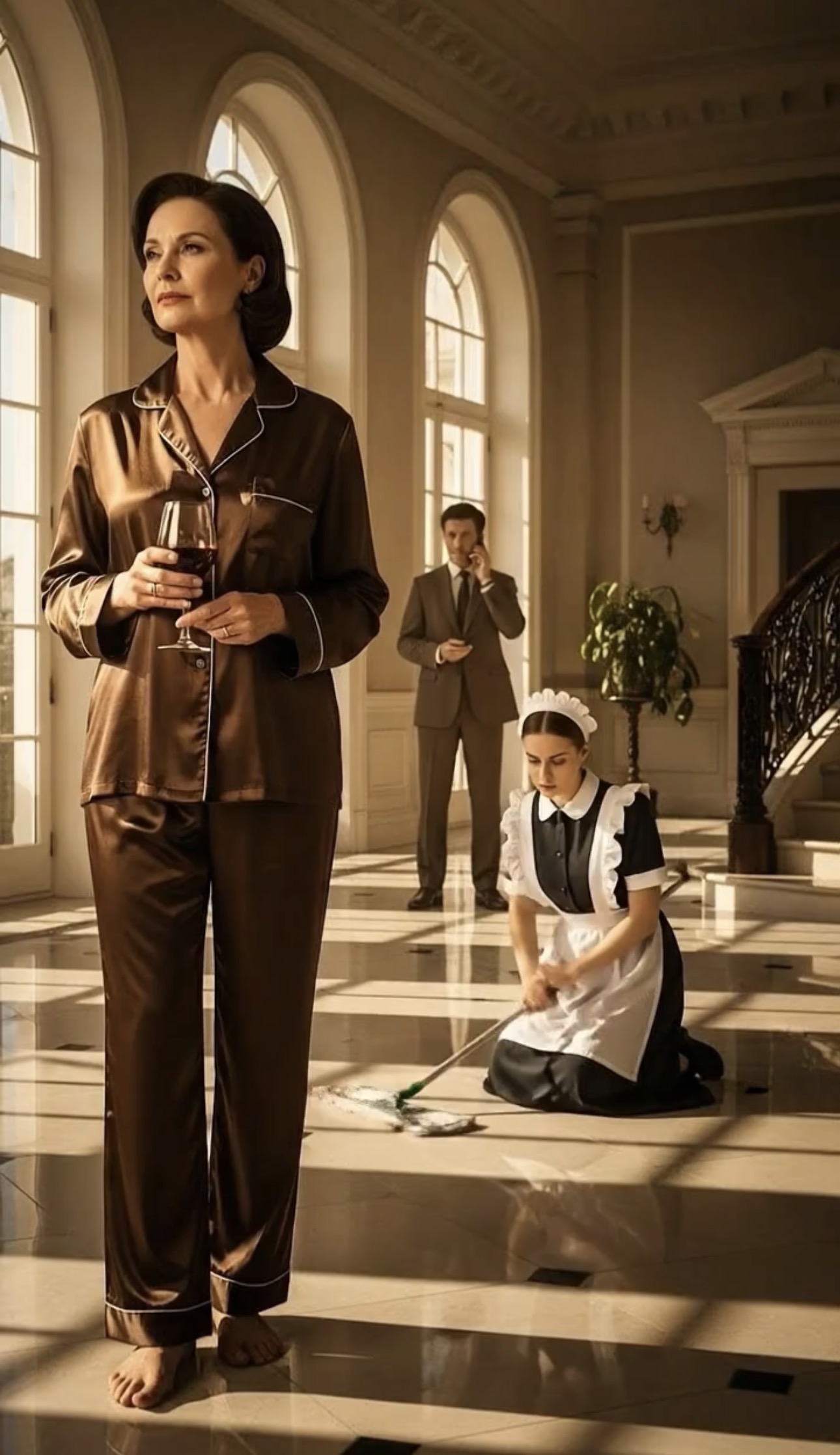A woman in a faded gray uniform, far too large for her thin frame, knelt near the sweeping staircase, scrubbing the marble floor with frantic determination. She looked like hired help—faceless, invisible—inside a house that belonged to my daughter.