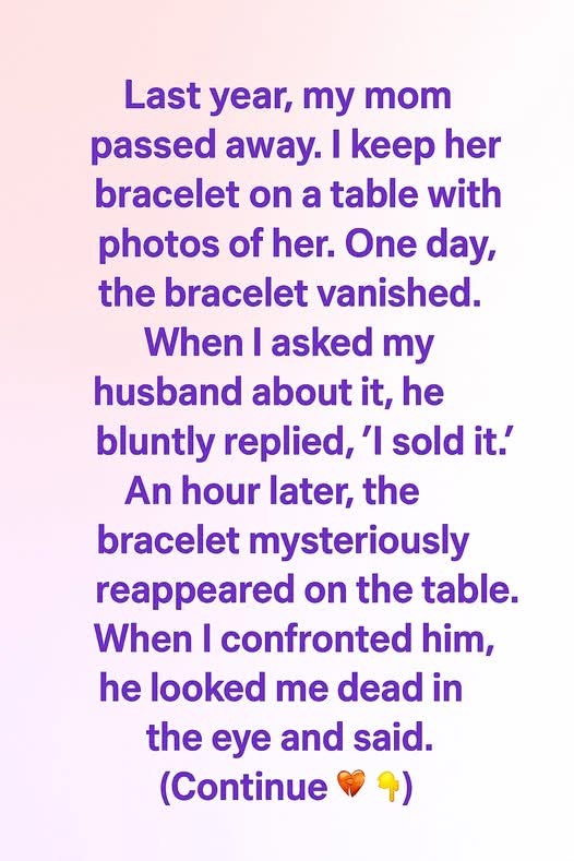 One morning, I noticed the bracelet was gone. My heart sank. I searched everywhere — under the table, in drawers, even inside the couch cushions — but it was nowhere to be found. Confused and upset, I asked my husband if he’d seen it. Without hesitation, he said, “I sold it,” and walked away. My chest tightened. I couldn’t believe he’d say something like that about something so precious. I felt hurt and betrayed.