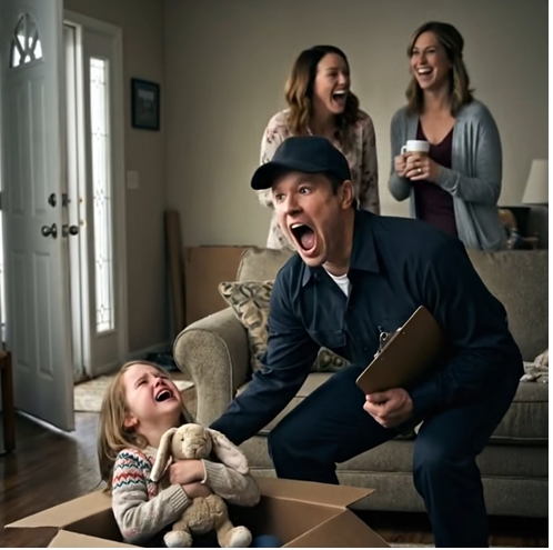 “Ma’am, it’s just a joke,” he said lightly. “I’m their neighbor. They asked me to act like I was here for… well, for pickup.”