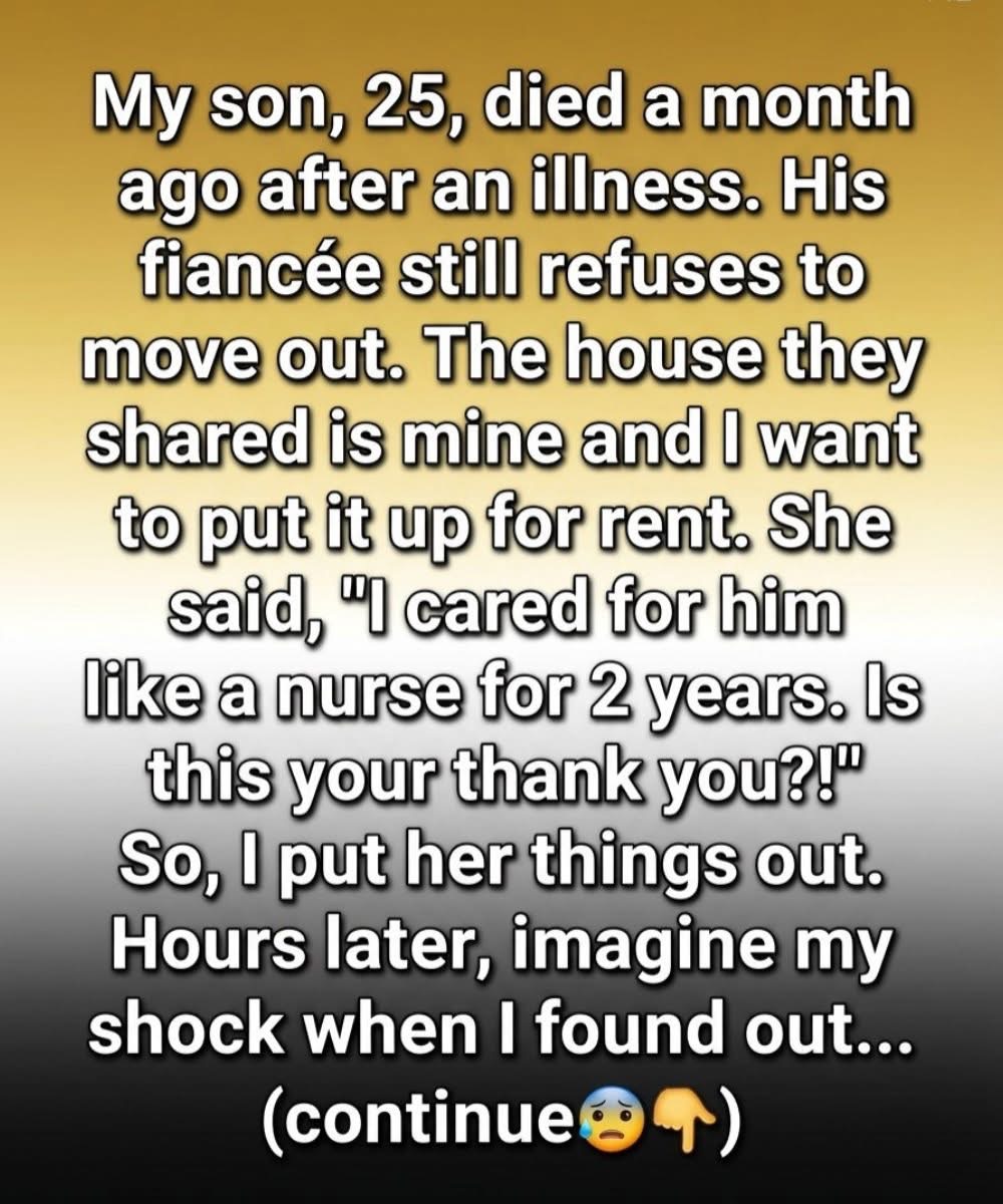 Grief hollowed me out in ways I didn’t recognize myself. In the middle of that fog, his fiancée was still living in the house they had shared—a house that legally belonged to me. I wanted to rent it out, partly for financial reasons, but mostly because walking past his empty room felt unbearable. When I told her she needed to leave, she looked at me with red, sleepless eyes and said, “I took care of him for two years like a nurse. Is this really your gratitude?” I didn’t answer. I put her belongings outside instead. At the time, I thought I was protecting myself. I had no idea my sorrow was blinding me to everything she had quietly done.
