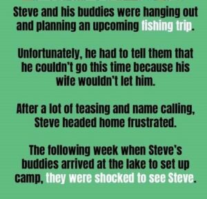 Steve and his buddies were hanging out and planning an upcoming fishing trip. Unfortunately, he had to tell them that he couldn’t go this time because his wife wouldn’t let him. After a lot of teasing and name calling, Steve headed home frustrated.