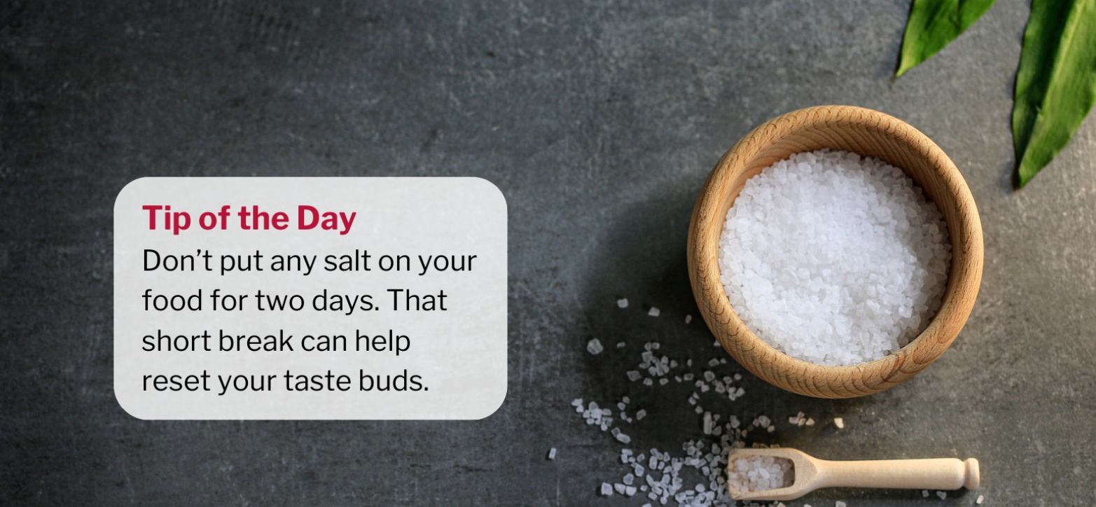 Try skipping added salt for just two days. This simple break can help retrain your taste buds and make it easier to enjoy foods with less sodium.