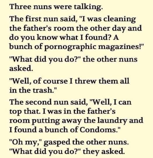 Three nuns were talking. The first nun said, “I was cleaning the father’s room the other day and do you know what I found? A bunch of pornographic magazines!” “What did you do?” the other nuns asked….