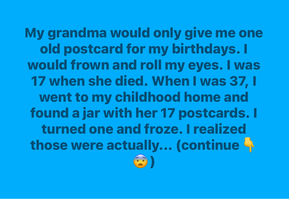 My grandma would only give me one old postcard for my birthdays. I would frown and roll my eyes. I was 17 when she died.When I was 37, I went to my childhood home and found a jar with her 17 postcards. I turned one and froze. It was not just a random postcard.She had written a small poem about me,filled with specific details from that year of my life. Some were sweet little observations; others were pieces of advice for my “future self,