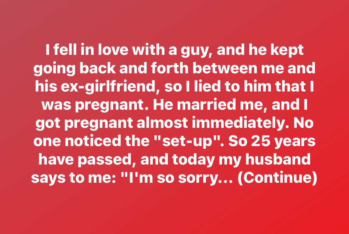 I fell in love with a guy, and he kept going back and forth between me and his ex-girlfriend, so I lied to him that I was pregnant. He married me, and I got pregnant almost immediately. No one noticed the “set-up”. So 25 years have passed,
