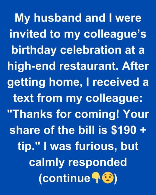 My husband and I were invited to my colleague’s birthday celebration at a high-end restaurant. After getting home, I received a text from my colleague: “Thanks for coming! Your share of the bill is $190 + tip.”