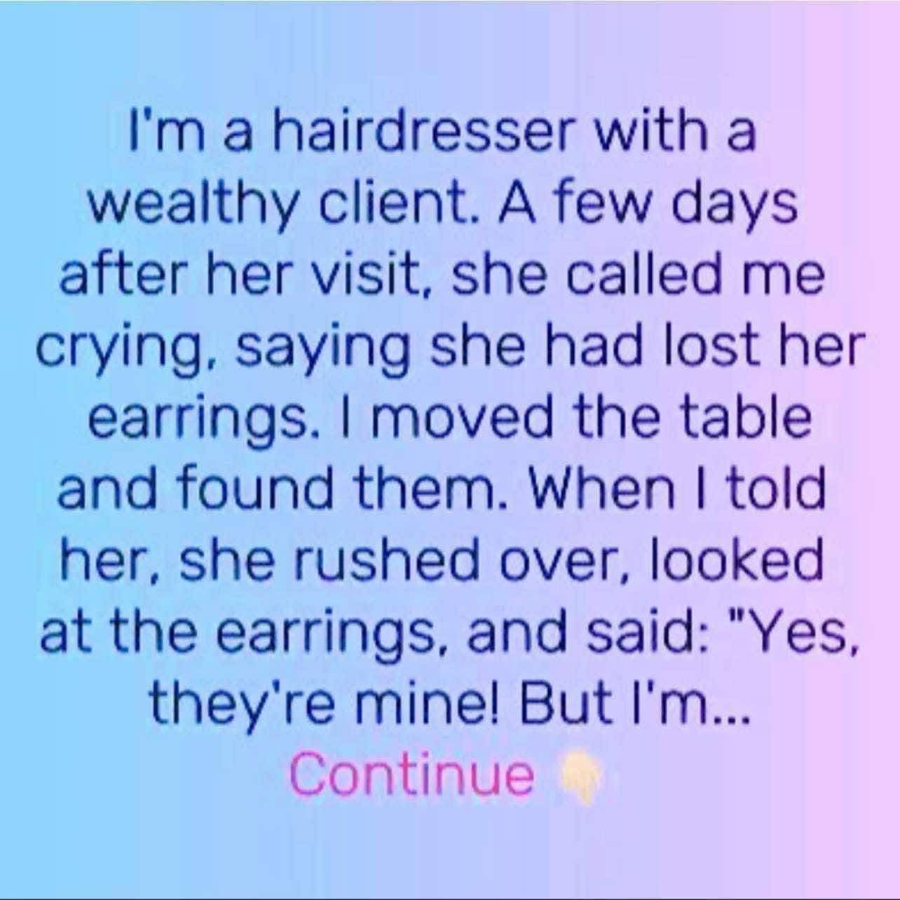 Working with other people can make you feel more stressed. It can be stressful to have even one strange client, and sometimes you have a few in a day. That being said, there are some customers or visitors that you will never forget, even years later. One could say that people who work with people don’t have boring jobs.I cut hair for a living.” My client is very wealthy. A few days after her visit, she broke down in tears and told me she had lost her earrings. Didn’t I find them?I pushed the table back, and there they were. This is what I told her.