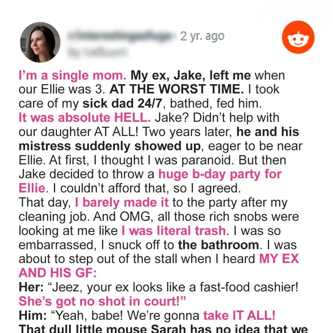 That’s… brave.” Then she laughed and told me to stay and help clean up. I held my tongue. For my daughter. But inside the restroom, hiding in a stall, I overheard something I wasn’t meant to hear. “I’m telling you, ” Candy said, “after this, we go for custody. She looks like she crawled out of a janitor’s closet. We’ll win.” “Then we control the trust,” Jake added. “That money is our shot. Beach house. Yoga studio. She has no idea,