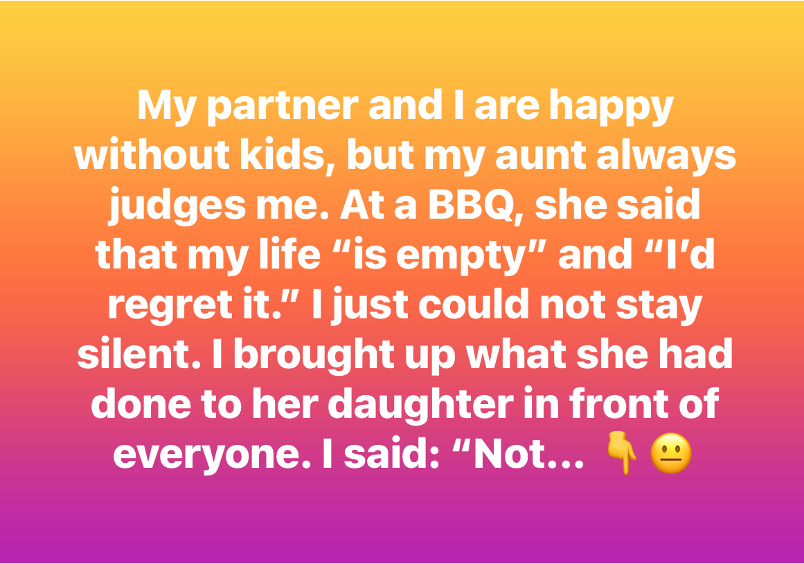 I never thought I’d be writing to you, but I’m torn between guilt and relief, and I really need to know — have I crossed a line, or have I finally just been honest? My partner and I have always known that we don’t want children. It’s not out of trauma or rebellion, just a quiet certainty that a childless life is what makes us happiest. We’re fulfilled — we volunteer, we travel, we nurture our relationships in other ways. We are happy without kids! Most people respect that, even if they don’t understand it. But my aunt Linda always judges me for it. Every holiday or family event, she finds a way to bring it up. ’You’ll never know true love. You’ll regret it when it’s too late.’ Once she even said, ’