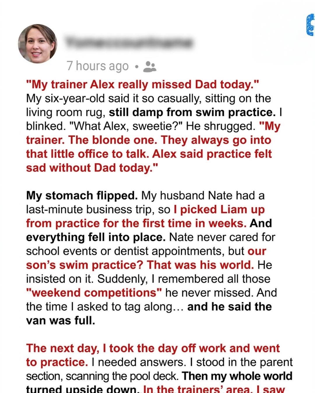 It was just another Tuesday when my five-year-old son, Liam, said something that changed everything. “Alex missed Dad today,” he told me after swim practice. Alex — the young, blonde swim coach. The one my husband, Nate, always saw when he took Liam to lessons. The one I’d never met. That innocent comment cracked open a truth I’d ignored for too long. Nate was never the engaged parent. Except when it came to swim. That was their thing, and I respected that. But now, it all made sense — his cologne, the humming, the way he shut me out of meets. And the one time I asked to join,