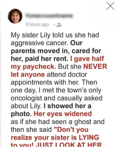 When my sister Lily told us she had stage-three cervical cancer, our world crumbled. My parents dropped everything and moved in with her to help. I wanted to visit immediately, but Lily said she needed time before seeing me. That should’ve been the first red flag, but we were too worried to question her.